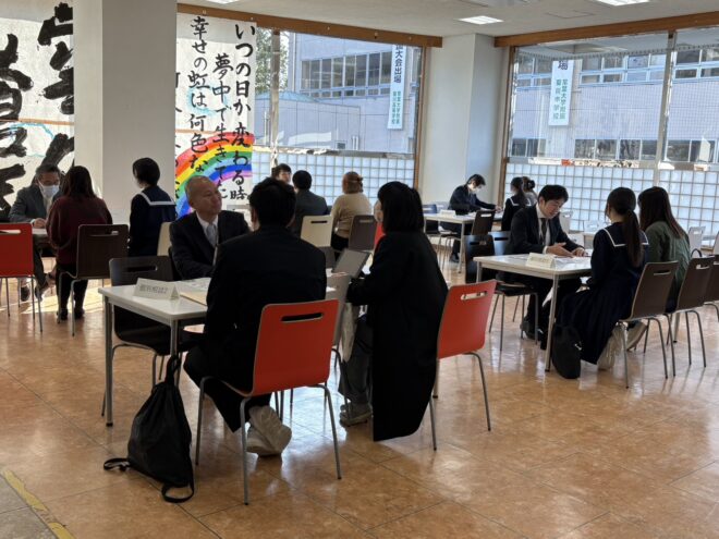 11/22本校にて中3生・保護者様対象の学校説明会、個別相談会を開催しました。説明会会場の講堂は補助席を追加して対応させていただくほど。個別相談会にも50組を超える相談があり、大盛況でした。個別相談では、熱心に質問される様子があちこちで見られました。