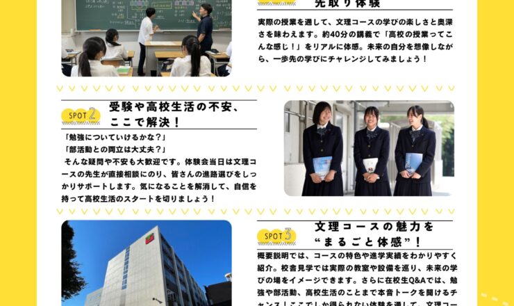 10月1日(水)から文理コース授業体験会および学校説明会・個別相談会①②③の申し込みが始まります。 申し込みはこちらからも可能です。(ただし10月1...